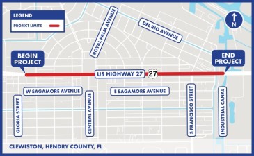 This project includes the design of roadway improvements to US 27 from Industrial Canal to W Sagamore Avenue in Clewiston, Florida. The proposed improvements include resurfacing the roadway, median modifications, and drainage improvements.